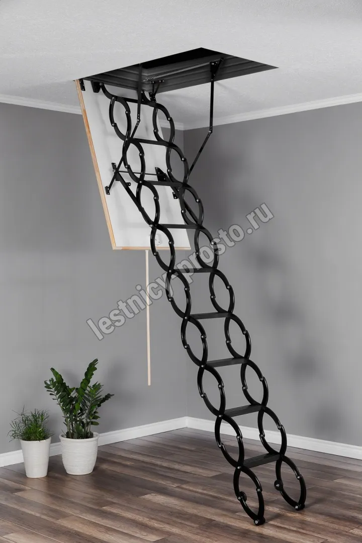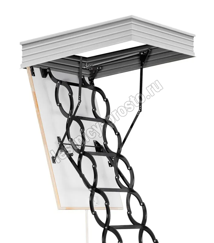 Все элементы лестницы выполнены из экологически чистых материалов и обработаны веществами, не содержащими тяжелых металлов. На ступенях антискользящие насечки. Короб лестницы изготовлен из металла. Термоизоляционная крышка типа "сэндвич" утеплена пенопластом, облицована с двух сторон ДСП белого цвета. Короб люка с уплотнителем. В комплекте деревянный стержень для открывания лестницы.