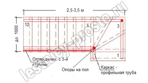 Ограждение начинается с пятой ступени лестницы.<br>
