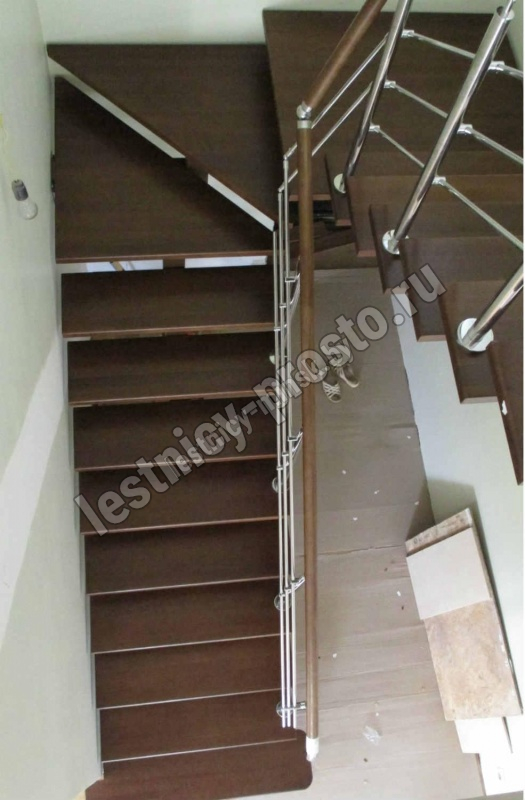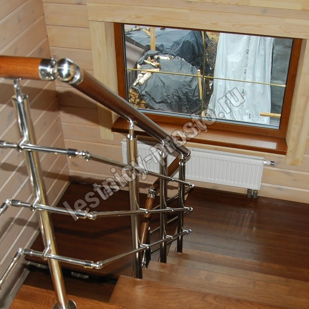 В комплекте буковый поручень, диаметром 50 мм. без какого либо покрытия, стойки из нержавеющей стали (устанавливаются через 1 ступень), диаметром 38 мм,