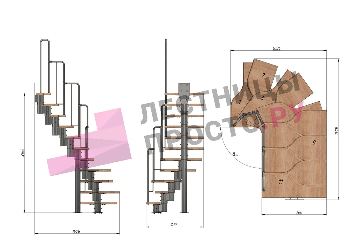 Лестница Prosto Urban Black гусиный шаг 700 мм, h198-288 см (11 ступеней), бук