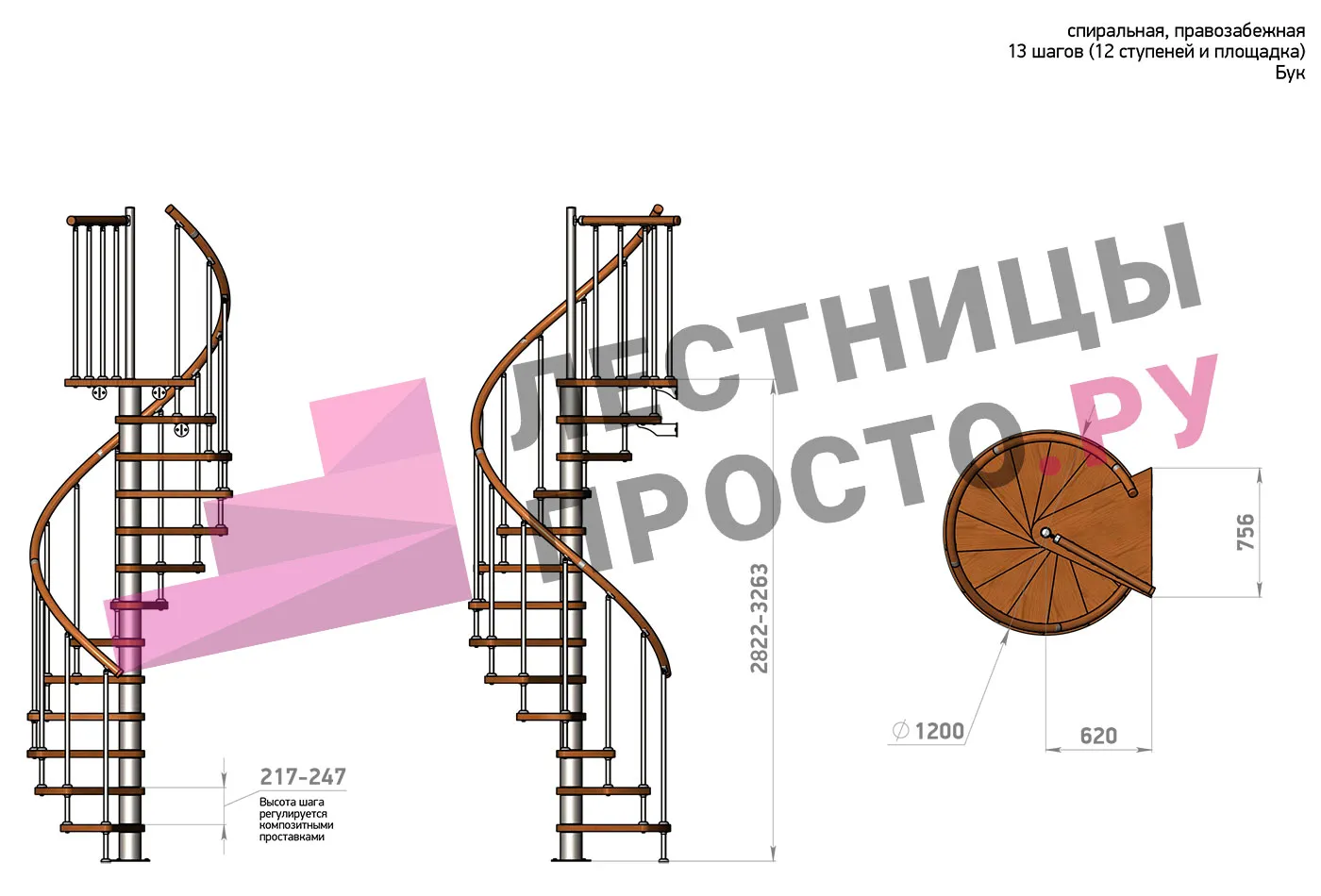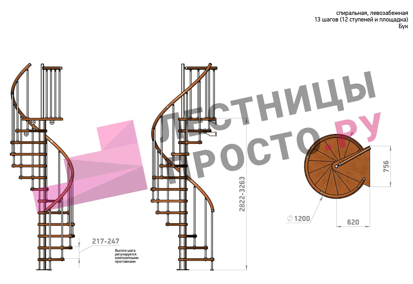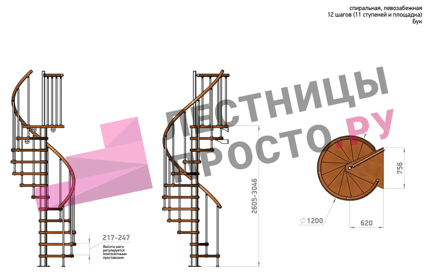 Высота ступеней регулируется с шагом 3 мм. в пределах 217-247 мм., благодаря чему, лестница прекрасно подгоняется под необходимую высоту.