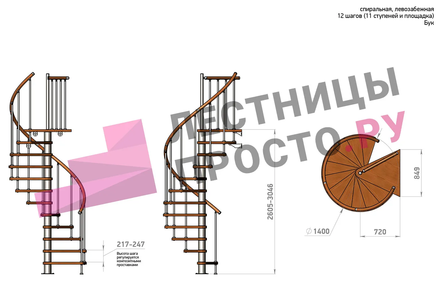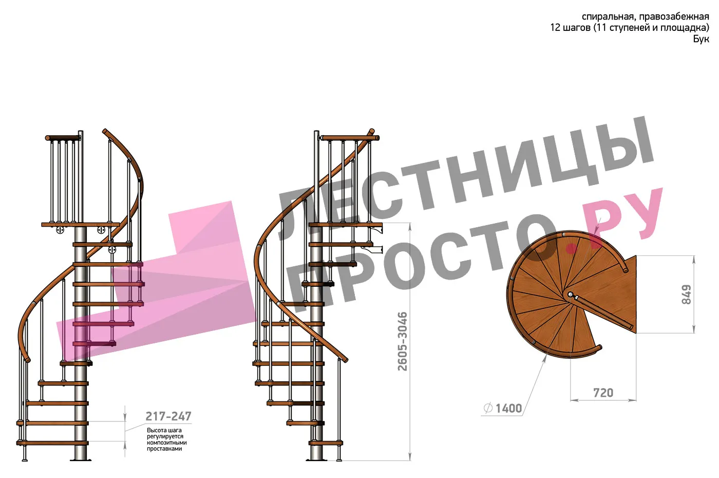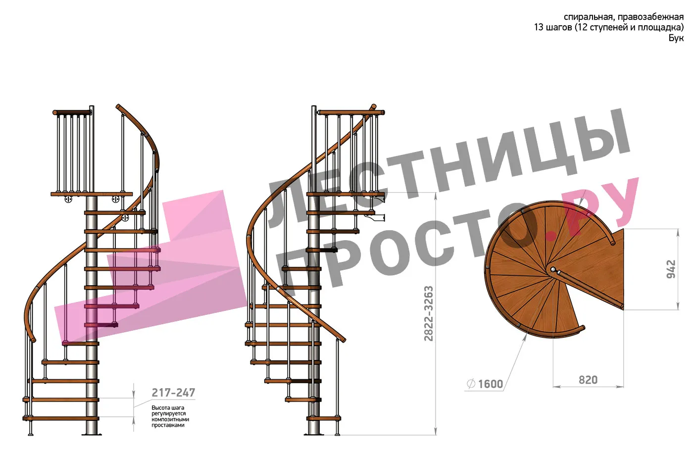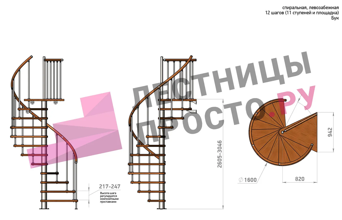 Высота ступеней регулируется с шагом 3 мм. в пределах 217-247 мм., благодаря чему, лестница прекрасно подгоняется под необходимую высоту.