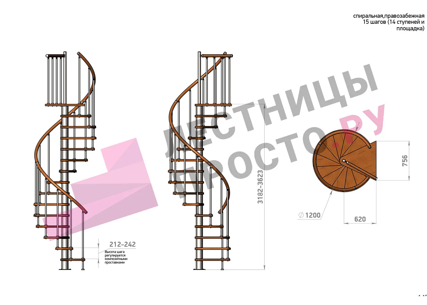 Высота ступеней регулируется с шагом 3 мм. в пределах 212-242 мм., благодаря чему, лестница прекрасно подгоняется под необходимую высоту.