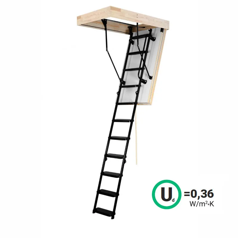 Ступени лестницы покрыты специальными накладками из износостойкого антискользящего материала. Площадка лестницы имеет универсальную форму, позволяющую встраивать лестницу в потолочные отверстия любой формы и размера. Высота лестницы (регулируется при установке): 2520 - 3050 мм. С помощью специальных дополнительных секций, высоту лестницы можно увеличить до 3760 мм. (Секции покупаются отдельно). Во время сборки, задаётся необходимое направление поворота лестницы. Материал каркаса: прессованная пластифицированная сталь