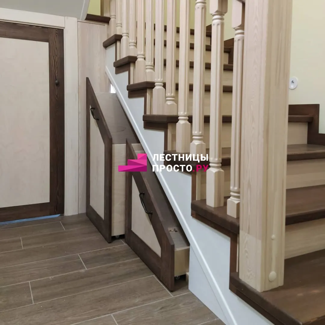 Организация пространства под лестницей: МДФ + сосна, покрытие - краска BIOFA.
